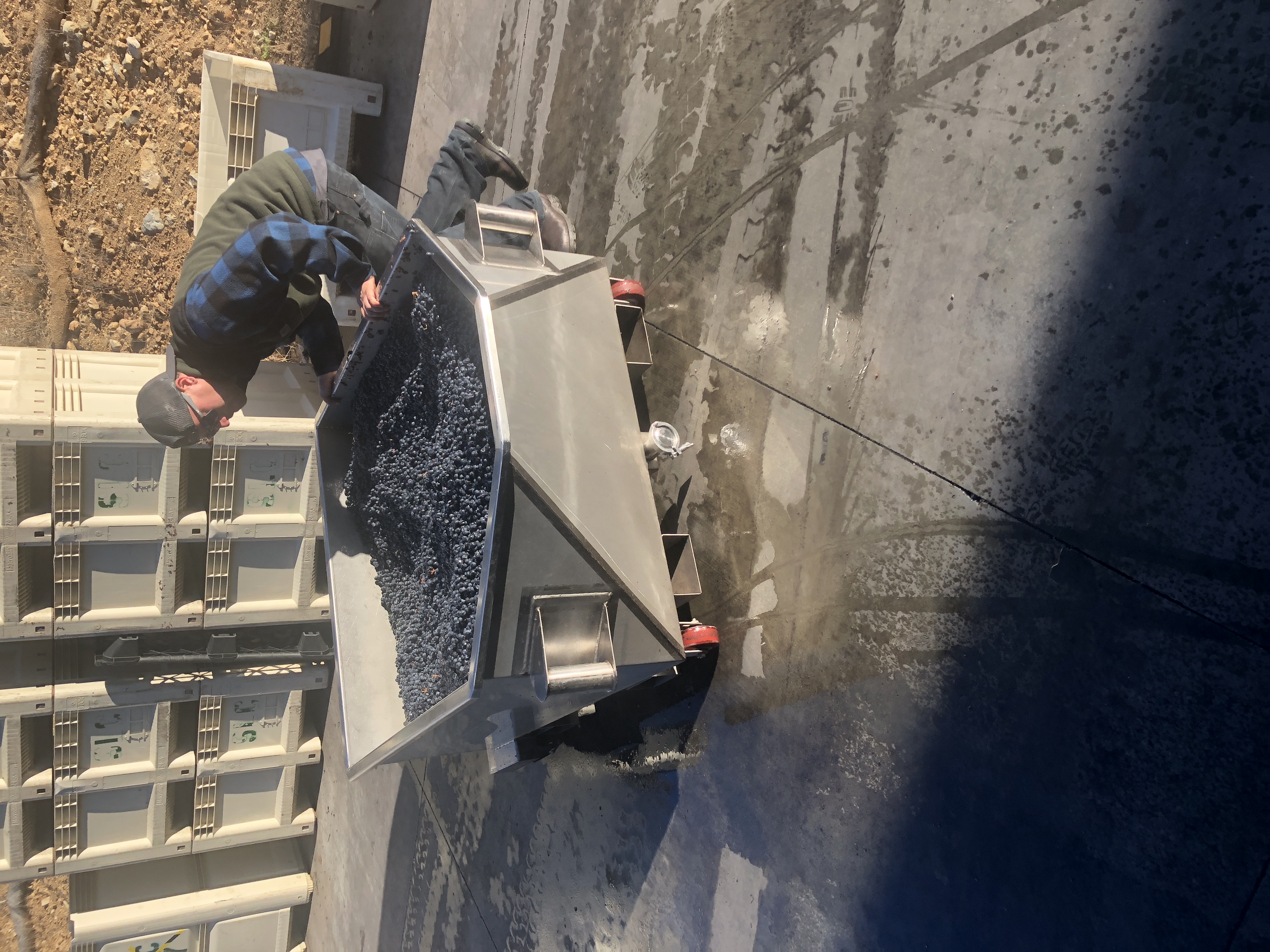 See below for a short video of our freshly picked clusters proceeding through the destemmer and a photo displaying the destemmed and carefully sorted grapes as they get pushed towards fermentation.